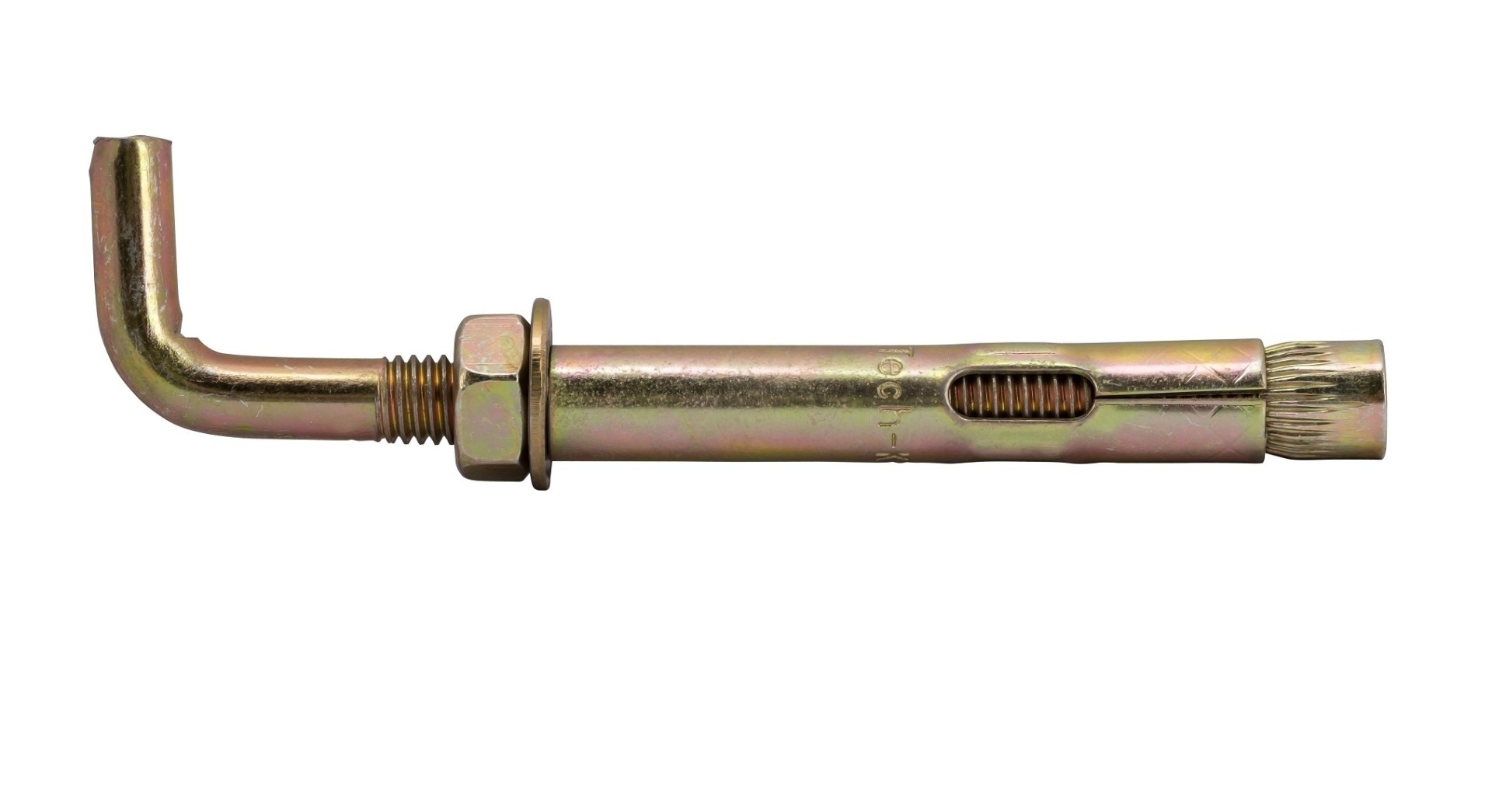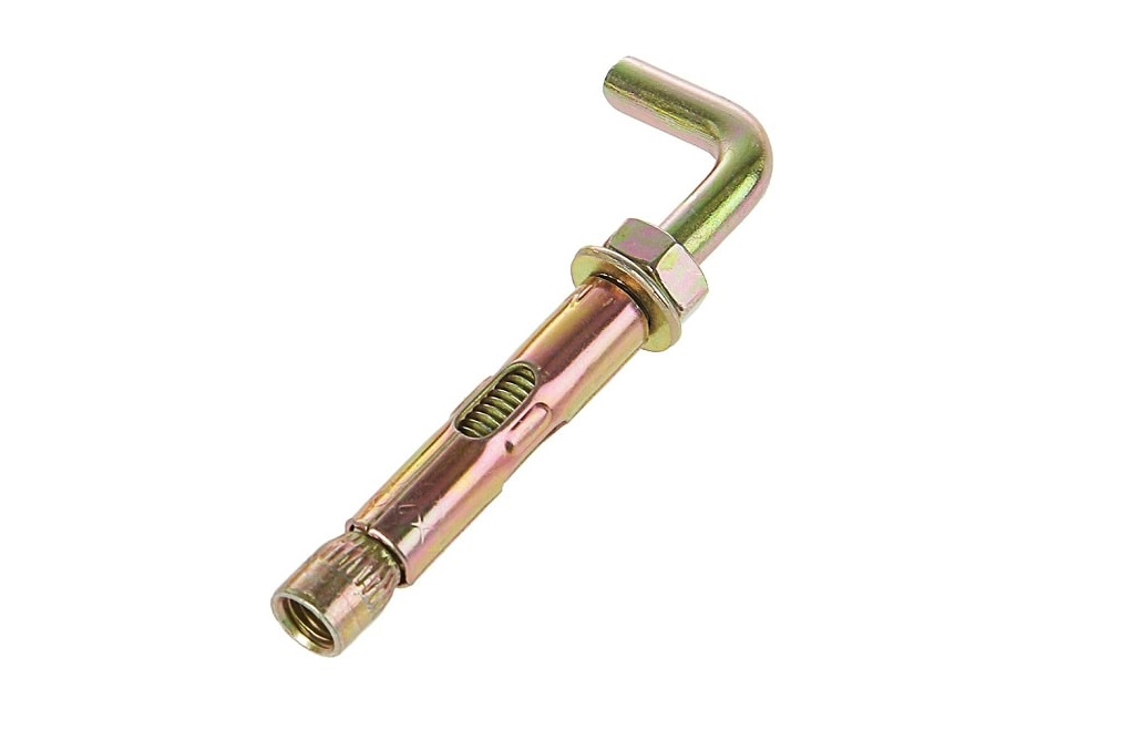 Анкер- Г-образный крюк применяется для крепления конструкций, обладающих высоким весом, кабельных трасс, строительных лесов, такелажного крепежа (тросов, цепей) к различным объектам из кирпича, бетона, камня. Абсолютно не подходит для умеренно плотных материалов: газосиликат, пустотный кирпич, шлакобетон, бетон с рыхлым наполнителем. Конструктивно анкерный болт с Г-образным крюком представляет собой стержень, один из концов которого загнут в форме прямого крюка, на другой конец нанесена резьба, оснащен распорным элементом, для более надежной фиксации в конструкции. Данный крепеж зачастую используют при динамических и резонансных нагрузках, соответственно рекомендуемая рабочая нагрузка не должна превышать 25% от максимальной (нагрузки на вырывание). Показатель нагрузки на вырывание диаметр 14 мм для бетона прочностью 200-250кгс/см2 составляет около 3000 кг/c. Отверстие под анкер должно быть 14 мм., глубина отверстия должна быть на 30 мм больше длинны погруженного крепежа. Анкер должен с небольшим усилием проходить в отверстие. Не забывайте прочищать отверстие от пыли: это упростит монтаж, а также повысит нагрузку на вырывание. Минимальная глубина анкеровки 50 мм. Допустимый момент затяжки 49 Нм. (не нужно зажимать гайку изо всех сил, можно сорвать резьбу, необходимо зажать и через неделю, по возможности, поджать). Момент затяжки должен произойти через 5-10 полных оборотов. Анкер можно зажимать вращая крюк или поджимая гайку под крюком.