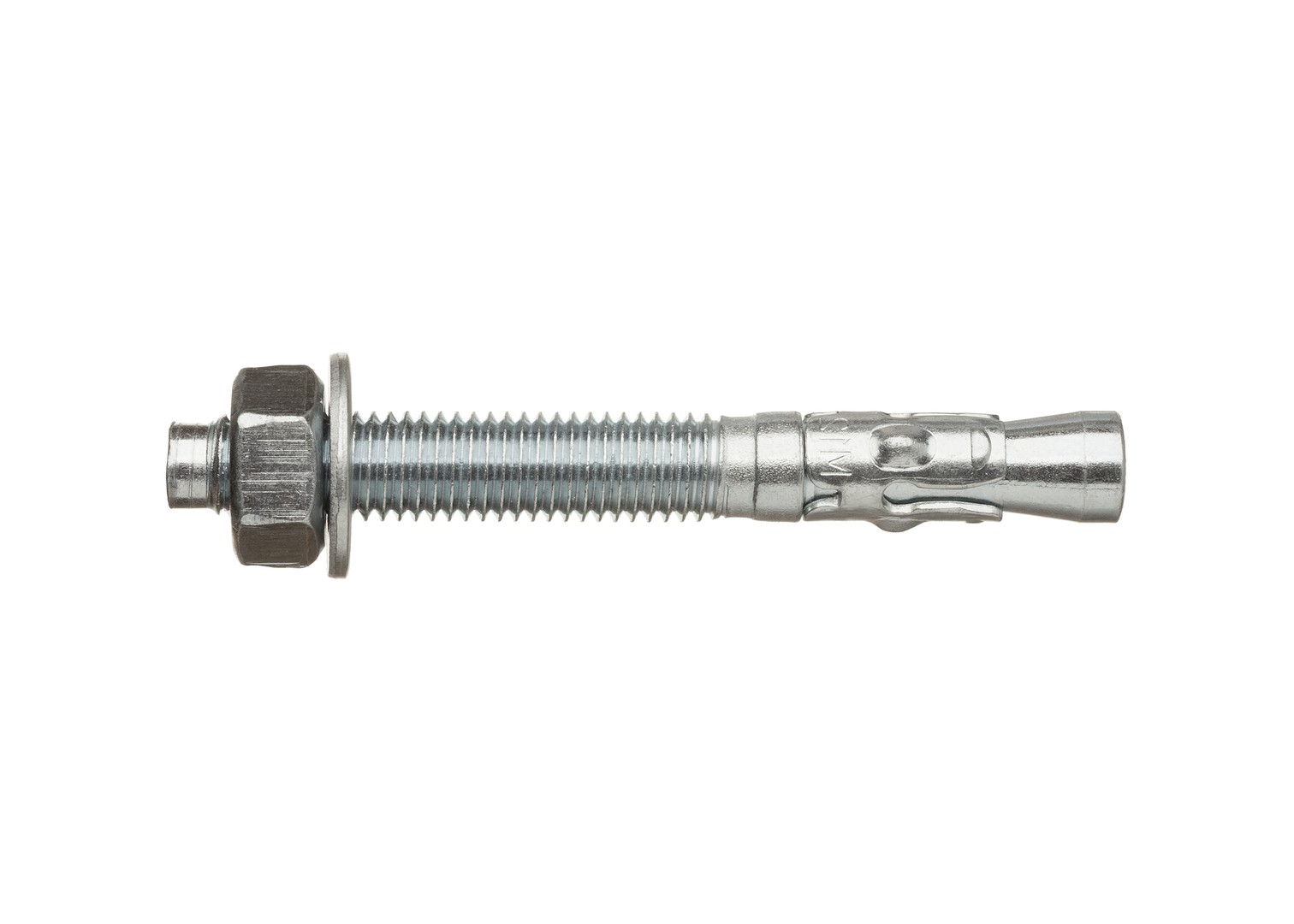 Анкер клиновой является самым прочным и надежным из всех видов анкеров. Его используют при ответственном креплении конструкций к каменным, бетонным, плотным кирпичным объектам, монтаже особо тяжелых элементов, например, кабельных трасс, лифтовых шахт. К данному виду крепежа предъявляют высокие требования к надежности и безопасности. Преимуществом использования клинового анкера является отсутствие необходимости точного расчета глубины сверления отверстия, так как при затягивании гайки на хвостовик находит муфта, что вызывает возникновение распирающей силы, которое прочно фиксирует конструкцию в закрепляемой основе. Тем не менее нужно очень ответственно подойти к подготовке монтажа. Распорная сила анкера очень маленькая, соответственно анкер должен применяться только в очень плотных материалах. Отверстие должно быть чистым, в отверстии не должно быть пустот, не должно быть арматуры. За процесс анкеровки отвечает стальная юбочка на анкере, если ее деформировать анкер работать не будет. Рекомендуемая рабочая нагрузка не должна превышать 25% от максимальной (нагрузки на вырывание). Показатель нагрузки на вырывание диаметр 8 мм для бетона прочностью 200-250кгс/см2 составляет около 1200 кг/c. Очень важно понимать, что нагрузка на вырывание это усредненный показатель, поэтому рабочая нагрузка не должна превышать 25%. Анкер можно использовать в динамических нагрузках, только при четком соблюдении правил монтажа. При установке анкеров в бетон с трещинами необходимо нагрузку на вырывание умножить на коэффициент 0,6. Отверстие под анкерный болт должно быть 8 мм., глубина отверстия должна быть на 20 мм больше длинны погруженного крепежа. Анкер должен с небольшим усилием проходить в отверстие. Не забывайте прочищать отверстие от пыли: это упростит монтаж, а также повысит нагрузку на вырывание. Проверьте диаметр бура, в процессе эксплуатации диаметр уменьшается, соответственно отверстие будет меньше 8 мм, что приведет к деформации анкера при монтаже. Отверстие в прикрепляемом материале должно быть минимум 10 мм., чтобы тело анкера свободно проходило. Минимальная глубина анкеровки 40 мм. Допустимый момент затяжки 24 Нм. (не нужно зажимать гайку изо всех сил, можно сорвать резьбу, необходимо зажать и через неделю, по возможности, поджать). Момент затяжки должен произойти через 5-10 полных оборотов. В процессе зажатия из анкера выступает шпилька, ее после монтажа можно обрезать.