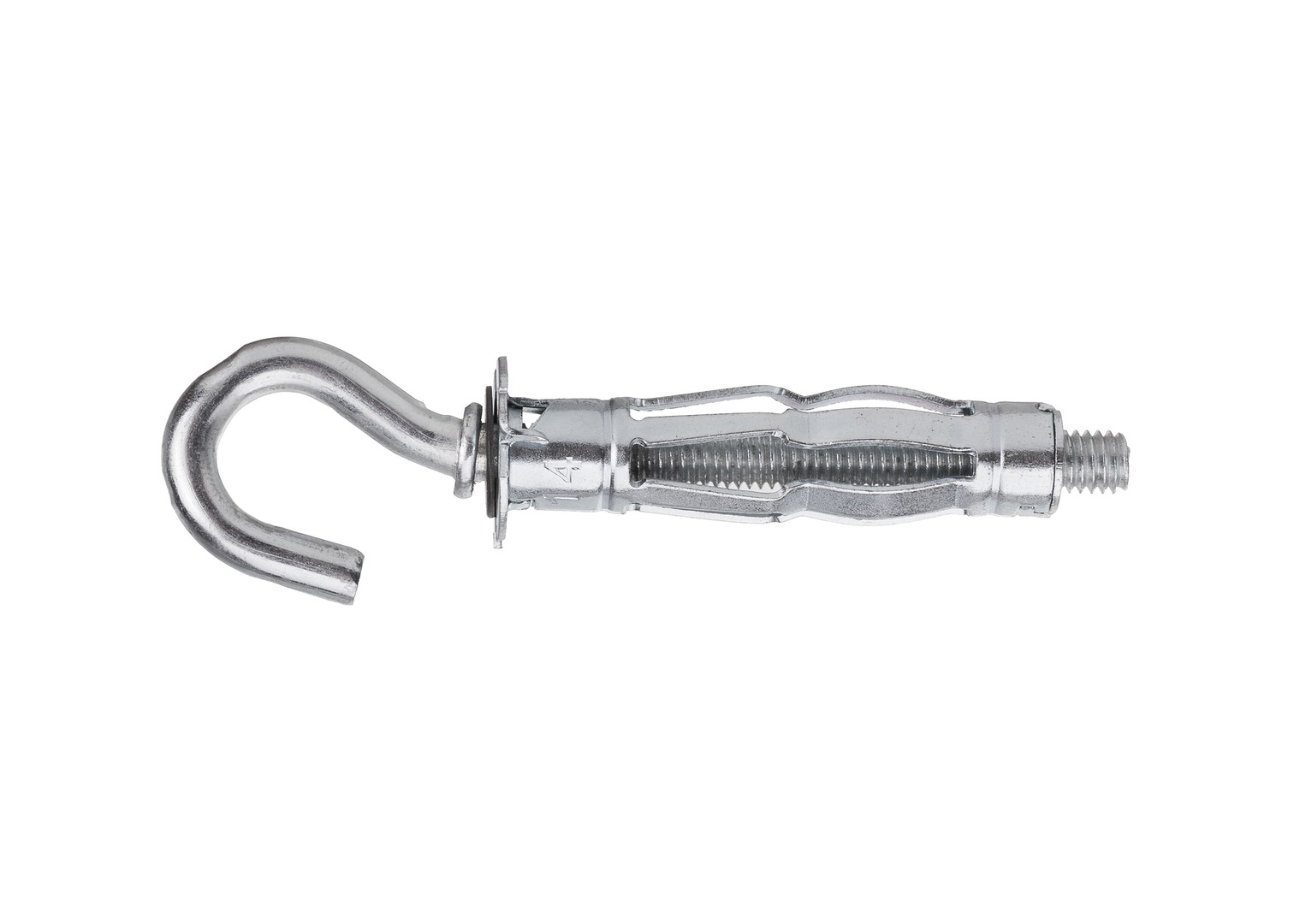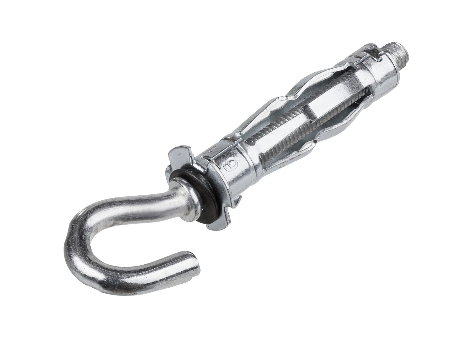 Дюбель для пустотелых конструкций используются для крепления полок, навесных шкафов, карнизов, люстр, антенн и т.д. к листовым стройматериалам (гипсокартон, гипсоволокно, волокнистый цемент, ДСП), а также к материалам с пустотами (потолочные перекрытия, щелевые кирпичи и газобетонные блоки). Дюбель состоит из полой цанги и винта. Цанга, в свою очередь, состоит из нераспорной части, длина которой подбирается под толщину несущей основы, и четырех фиксирующих сегментов. Бортик дюбеля защищает его от проваливания в отверстие. Острые зубцы, расположенные на стопорном бортике, предотвращают проворачивание дюбеля. Крепление осуществляется методом предварительного монтажа: Подобрать дюбель необходимой длины, в соответствии с толщиной несущей основы. Просверлить отверстие, согласно размерам, указанным изготовителем и очистить его. Вставить дюбель в отверстие и при помощи специальных монтажных клещей зафиксировать его. Закрутить винт до нужной глубины с помощью отвертки или шуруповерта. Внимание! Дюбель монтируется специальными клещами, а вручную (отверткой и плоскогубцами) не получается: происходит деформация лепестков. Диаметр отверстия под дюбель 8 мм. Толщина стенки пустотелого материала до 3-12мм.
