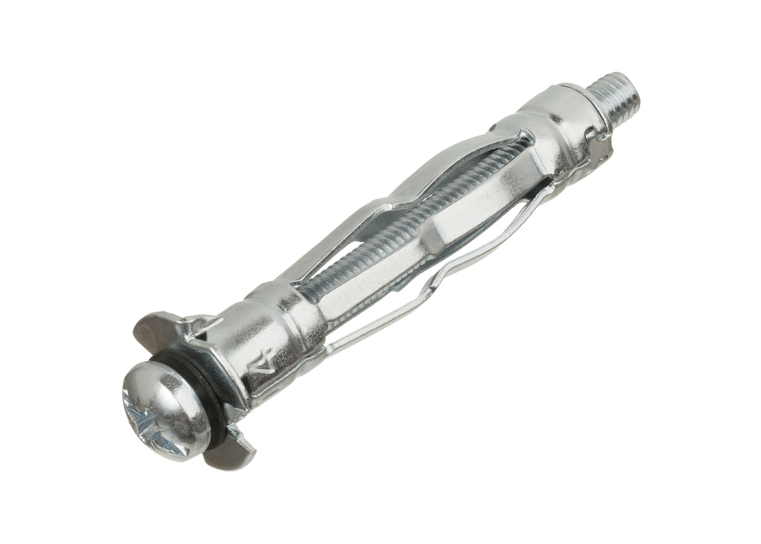 Дюбель для пустотелых конструкций используются для крепления полок, навесных шкафов, карнизов, люстр, антенн и т.д. к листовым стройматериалам (гипсокартон, гипсоволокно, волокнистый цемент, ДСП), а также к материалам с пустотами (потолочные перекрытия, щелевые кирпичи и газобетонные блоки). Дюбель состоит из полой цанги и винта. Цанга, в свою очередь, состоит из нераспорной части, длина которой подбирается под толщину несущей основы, и четырех фиксирующих сегментов. Бортик дюбеля защищает его от проваливания в отверстие. Острые зубцы, расположенные на стопорном бортике, предотвращают проворачивание дюбеля. Крепление осуществляется методом предварительного монтажа: Подобрать дюбель необходимой длины, в соответствии с толщиной несущей основы. Просверлить отверстие, согласно размерам, указанным изготовителем и очистить его. Вставить дюбель в отверстие и при помощи специальных монтажных клещей зафиксировать его. Закрутить винт до нужной глубины с помощью отвертки или шуруповерта. Внимание! Дюбель монтируется специальными клещами, а вручную (отверткой и плоскогубцами) не получается: происходит деформация лепестков. Диаметр отверстия под дюбель 12 мм. Толщина стенки пустотелого материала до 3-16 мм.