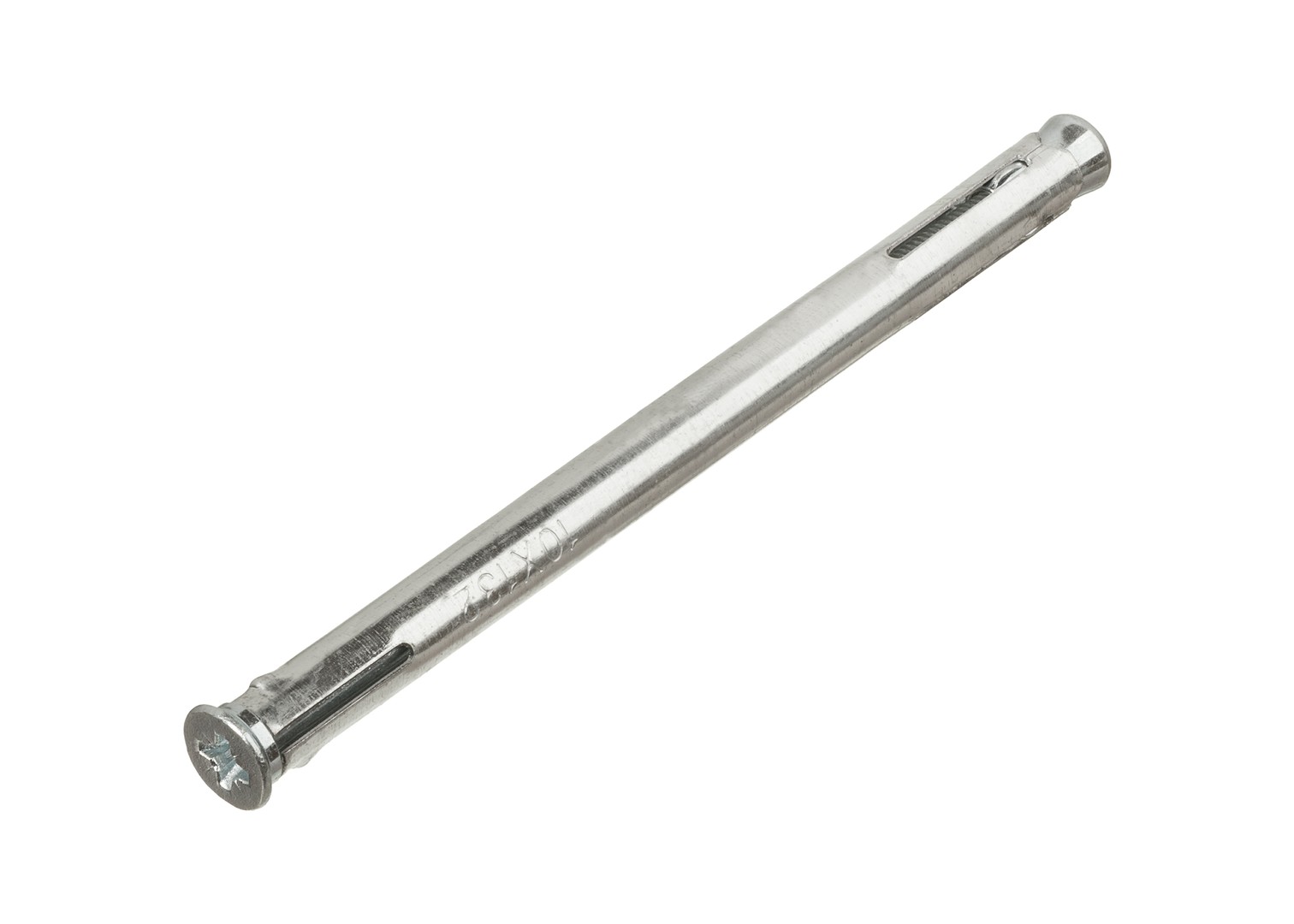 Металлический рамный дюбель применяется при монтаже оконных или дверных конструкций, изготовленных из дерева, пластика, металла, к бетонному, кирпичному, каменному основанию. Абсолютно не подходит для умеренно плотных материалов: газосиликат, пустотный кирпич, шлакобетон, бетон с рыхлым наполнителем. Конструктивно анкер рамный представляет собой винт, на одном конце которого расположена шляпка со специальным отверстием под определенную насадку-биту, на другом конце находится специальный элемент, выполняющий функцию распора. При закручивании винта с метрической резьбой происходит втягивание конусообразной втулки в тело дюбеля, что приводит к распиранию стенок дюбеля в просверленном отверстии и позволяет надежно удерживать монтируемые детали, а также производить их юстировку. Гильза рамного дюбеля имеет специальные ребра, предотвращающие проворачивание втулки и всей конструкции внутри отверстия. Крепление осуществляется методом монтажа с зазором: просверлить отверстие по размерам изготовителя и очистить его, вставить рамный дюбель через монтируемую деталь в несущую основу, завинтить винт до упора. При креплении в пустотелых материалах длину дюбеля следует выбирать таким образом, чтобы была задействована, как минимум одна перегородка несущей основы. Показатель нагрузки на вырывание для бетона прочностью 200-250кгс/см2 составляет около 520 кг/c.