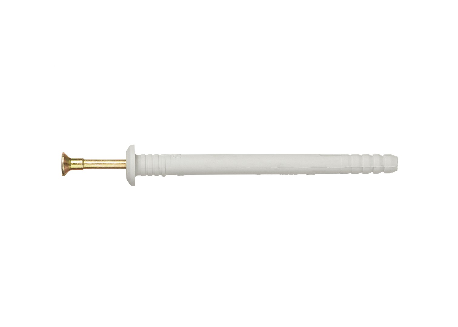 Дюбель-гвоздь с полуцилиндрическим или грибовидным бортиком предназначен для быстрого разборного монтажа различных конструкций в поверхность бетона, полнотелого кирпича, натурального камня и других видов твердых материалов. Изготавливается дюбель-гвоздь из полипропилена. Распорный стержень такого крепления выполнен из металла. Незаменим для монтажа профилей из металла и пластика, дверных коробок и оконных рам. При забивании гвоздя дюбель равномерно распирается в стенках отверстия. Дюбель-гвоздь позволяет значительно повысить производительность монтажных работ. Система крепежа долговечна и устойчива к воздействию окружающей среды. Прижимная шапка увеличивает площадь давления. Показатель нагрузки на вырывание диаметр 6 мм для бетона прочностью 200-250кгс/см2 составляет около 160 кг/c. Очень важно понимать, что нагрузка на вырывание это усредненный показатель, поэтому рабочая нагрузка не должна превышать 25%. Не желательно использовать дюбель-гвоздь в монтаже с динамическими нагрузками. Не забывайте прочищать отверстие от пыли: это упростит монтаж, а также повысит нагрузку на вырывание.