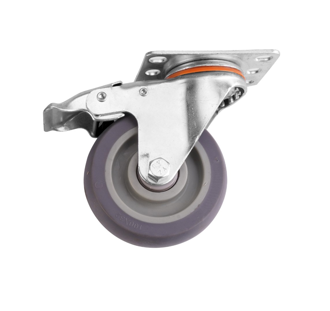 Поворотное с тормозом полиуретан-резиновое колесо средней грузоподъемности. Обладает теме же свойствами, что и полиуретановое, но имеет большую аммортизацию.  Применяется и в помещениях, и вне зданий. Способно передвигаться по грубым полам, свойственным складским и производственным зданиям.  Обод поворотной промышленной опоры оцинкован, изготовлен из стали. Примененный тип крепления кронштейна - площадка.  Материал ролика поворотного промышленного колеса – это качественный полиуретан.