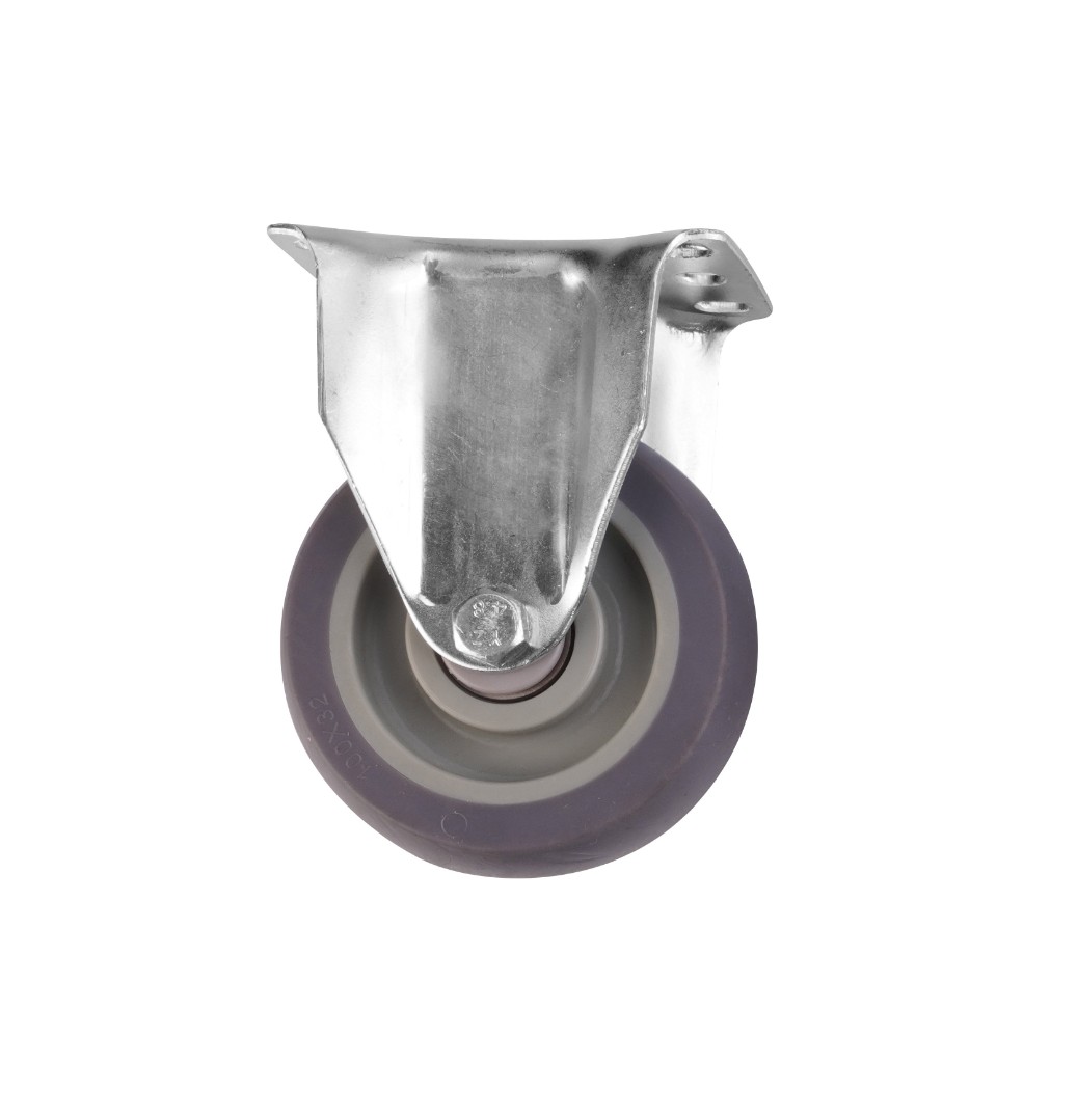 Неповоротное полиуретан-резиновое колесо средней грузоподъемности. Обладает теме же свойствами, что и полиуретановое, но имеет большую аммортизацию. Применяется и в помещениях, и вне зданий. Способно передвигаться по грубым полам, свойственным складским и производственным зданиям.  Обод неповоротной промышленной опоры оцинкован, изготовлен из стали. Примененный тип крепления кронштейна - площадка.  Материал ролика неповоротного промышленного колеса – это качественный полиуретан.