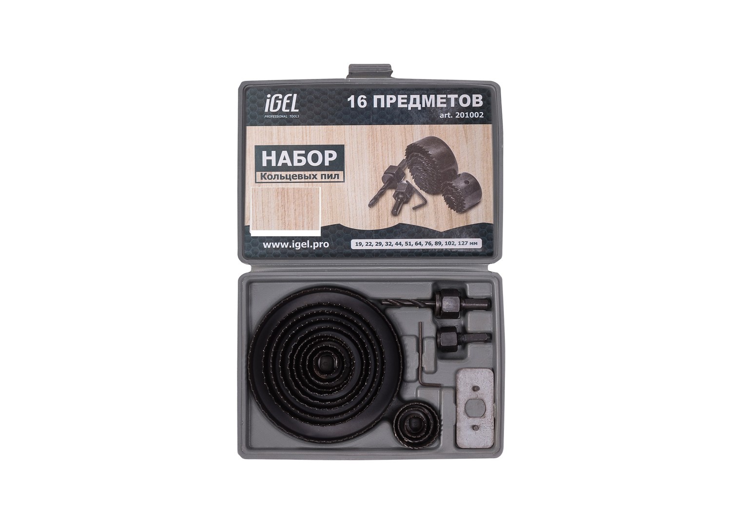 Состав набора: 11 коронок: 19, 22, 29 32 44, 51, 64, 76, 89, 102, 127 мм. 2 держателя + сверло и ключ. Рабочая часть коронок изготовлена из высококачественной инструментальной стали. Сталь 45. Селективная закалка. Твердость 50–55 HRc. Применения по дереву, пластику, гипсокартону.