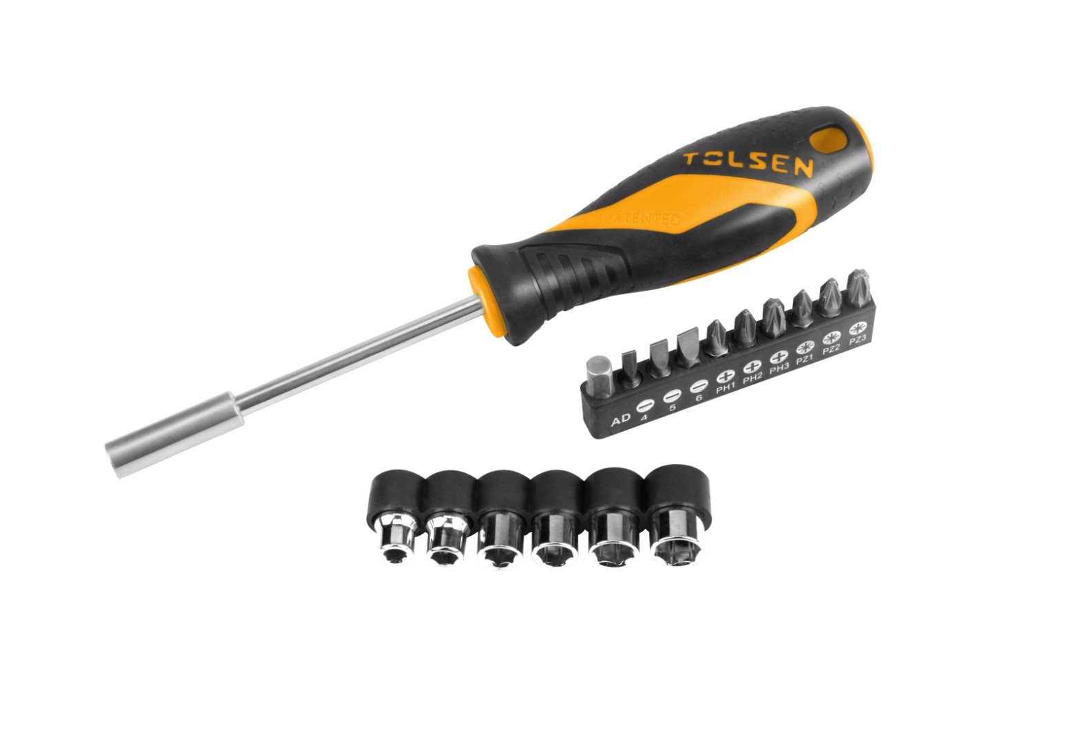 Двухкомпонентная нескользящая рукоятка эргономичной формы. 10 шт. бит CrV: 1/4″ x 25 мм: SL4, SL5, SL6 PH1, PH2, PH PZ1, PZ2, PZ3.  Адаптер для бит 1/4″. 6 шт. головок 1/4″ 5 мм, 6 мм, 7 мм, 8 мм, 9 мм, 10 мм. Упаковка: двойной блистер.