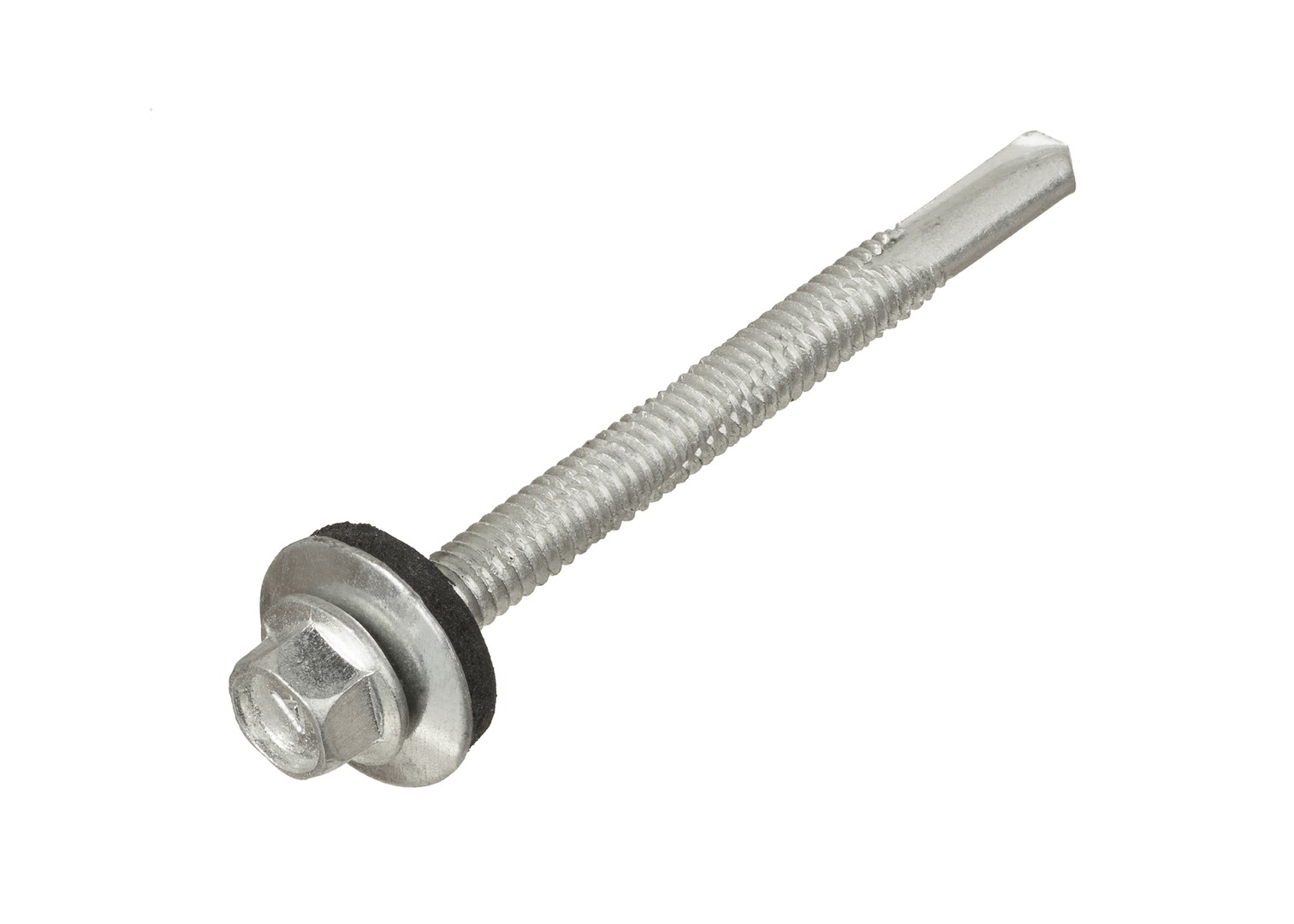 Саморез кровельный по металлу удлиненное сверло служит для крепления металлических кровельных материалов к металлическим конструкциям, в том числе и в случае наложения металлических листов друг на друга. Кроме кровельных материалов при помощи кровельного самореза по металлу можно также крепить облицовочные металлические листы при облицовке фасадов. Шуруп для монтажа кровельных материалов снабжается прокладкой из резины, которая обеспечивает достаточную герметичность в местах соединения конструкций. Удлиненное сверло способно проходить достаточно твердые и толстые стали. Крепление очень удобно в использовании и не требует предварительного сверления отверстий в используемых материалах. Диаметр сверла самореза 6,3 ( 5,55-5,7), длина сверла 6,3 - (11,5) мм. Толщина резины 2,4-2,8 мм, толщина шайбы 0,70-0,90 мм , Твердость сердцевины, HV 240-425. Толщина просверливаемого металла: сталь 12 мм.