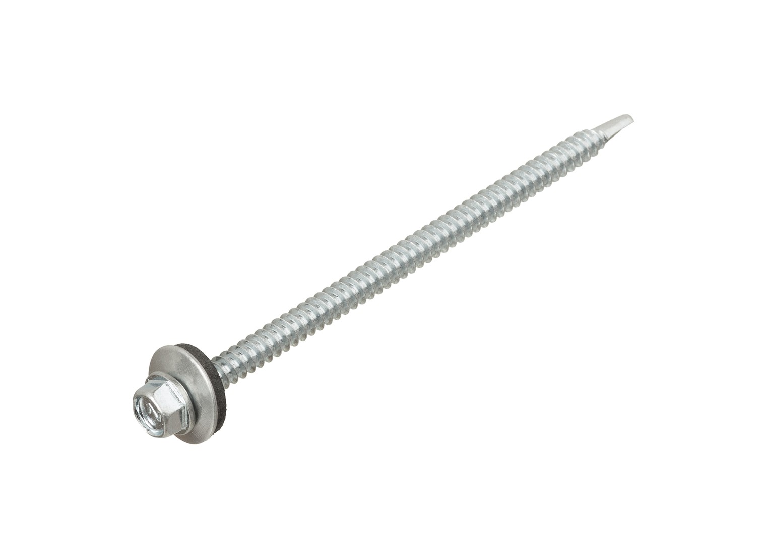 Саморез кровельный по металлу служит для крепления металлических кровельных материалов к металлическим конструкциям, в том числе и в случае наложения металлических листов друг на друга. Кроме кровельных материалов при помощи кровельного самореза по металлу можно также крепить облицовочные металлические листы при облицовке фасадов. Шуруп для монтажа кровельных материалов снабжается прокладкой из резины, которая обеспечивает достаточную герметичность в местах соединения конструкций. Саморезы оцинкованные кровельные представляют собой шурупы с наконечником в виде сверла и головкой-шестигранником. Крепление очень удобно в использовании и не требует предварительного сверления отверстий в используемых материалах. Диаметр сверла самореза 5,5 ( 4,55-4,7), длина сверла 5,5 (7,5-9,0) мм. Толщина резины 2,4-2,8 мм, толщина шайбы 0,70-0,90 мм , Твердость сердцевины, HV 240-425. Толщина просверливаемого металла: сталь 5 мм.