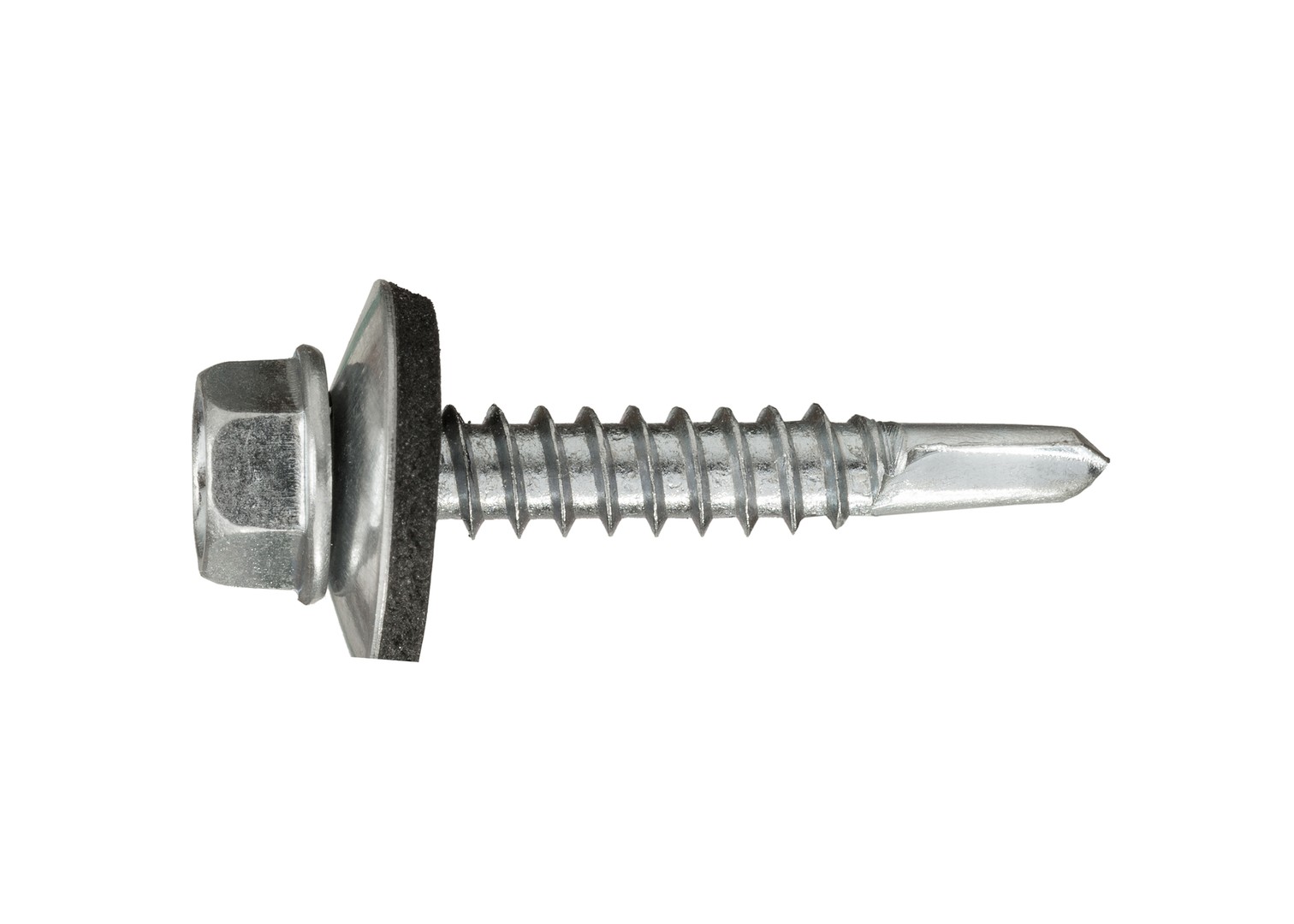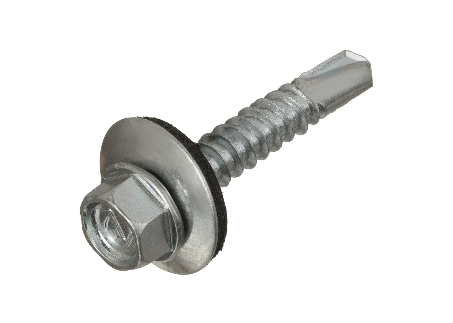 Саморез кровельный по металлу служит для крепления металлических кровельных материалов к металлическим конструкциям, в том числе и в случае наложения металлических листов друг на друга. Кроме кровельных материалов при помощи кровельного самореза по металлу можно также крепить облицовочные металлические листы при облицовке фасадов. Шуруп для монтажа кровельных материалов снабжается прокладкой из резины, которая обеспечивает достаточную герметичность в местах соединения конструкций. Саморезы оцинкованные кровельные представляют собой шурупы с наконечником в виде сверла и головкой-шестигранником. Крепление очень удобно в использовании и не требует предварительного сверления отверстий в используемых материалах. Диаметр сверла самореза 5,5 ( 4,55-4,7), длина сверла 5,5 (7,5-9,0) мм. Толщина резины 2,4-2,8 мм, толщина шайбы 0,70-0,90 мм , Твердость сердцевины, HV 240-425. Толщина просверливаемого металла: сталь 5 мм.