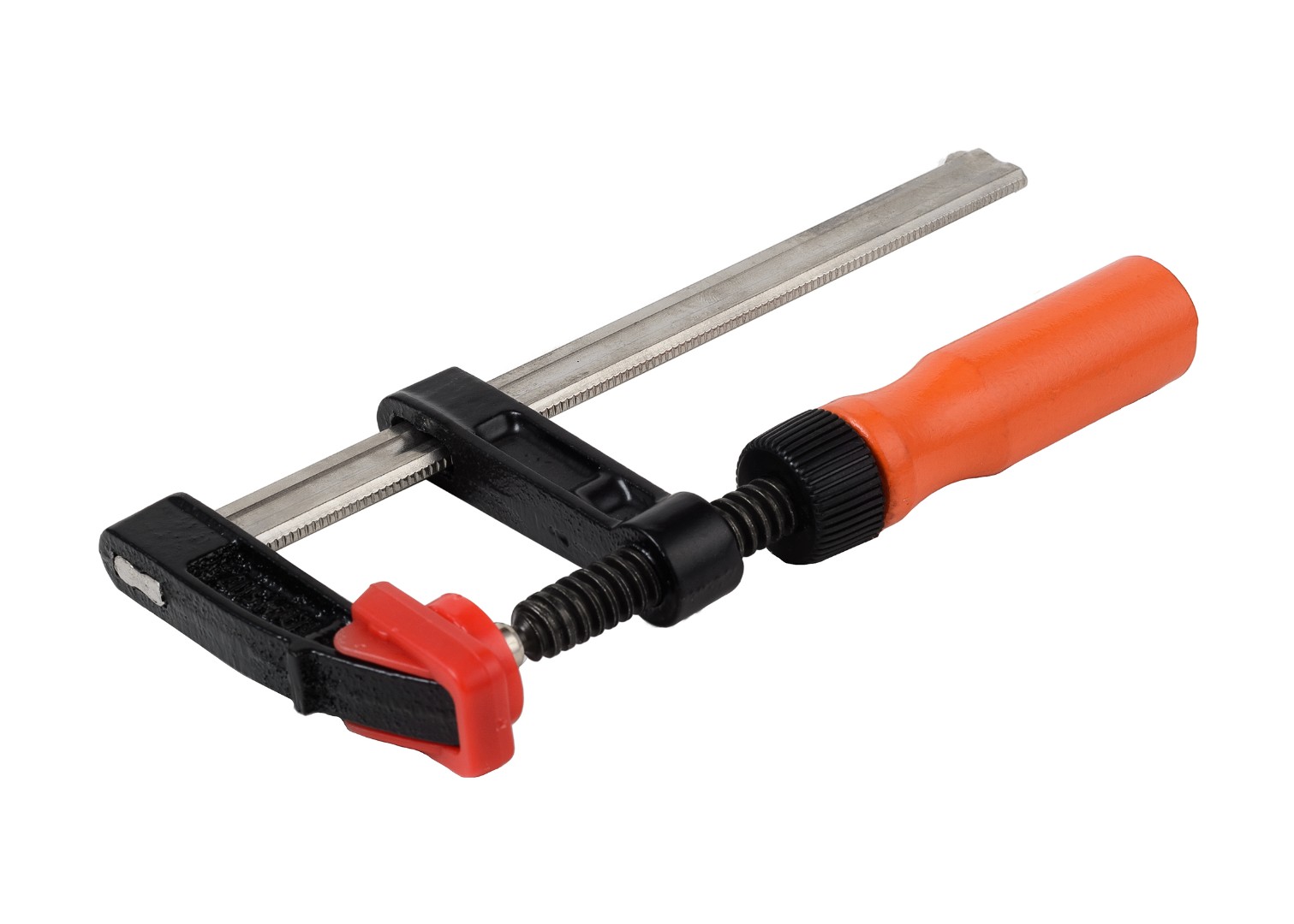 Столярная струбцина оснащена профилированной шиной с глубокими зубцами, препятствующая самопроизвольному проскальзыванию. Скобы из ковкого чугуна, волнистые ребра создают усилие до 5000 Н. Полиуретановые прокладки на губки препятствуют соскальзыванию и разрушению древесины. Широкий винт с глубокой резьбой облегчает монтаж струбцины.