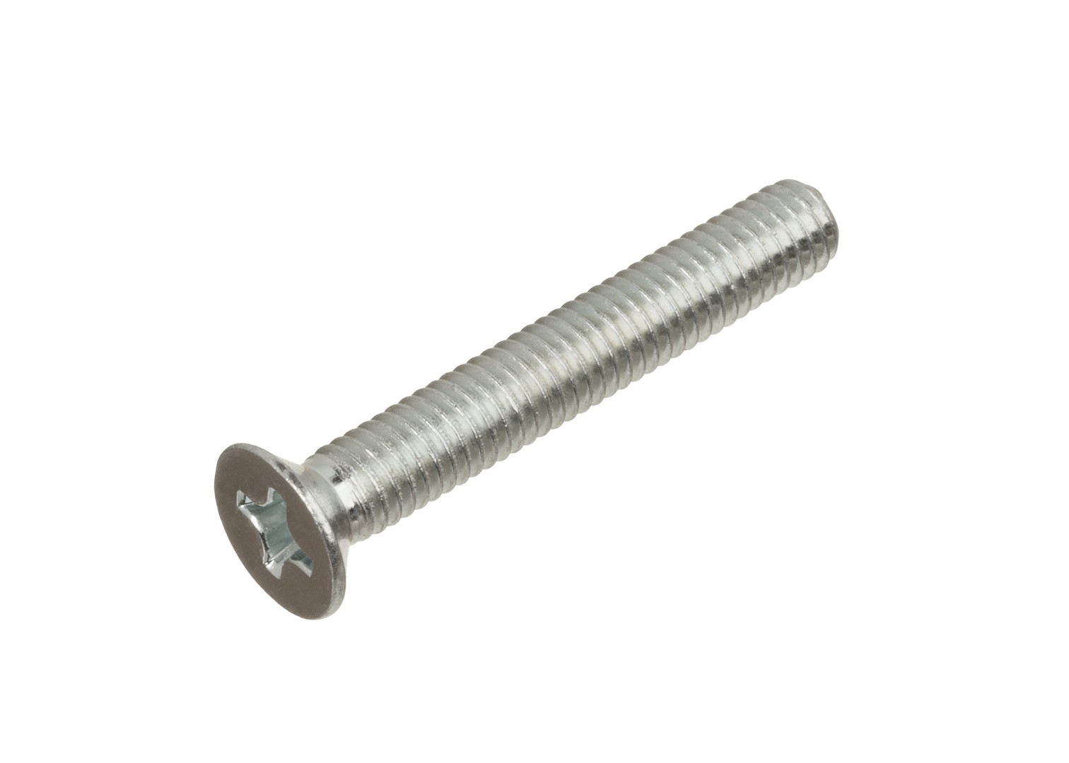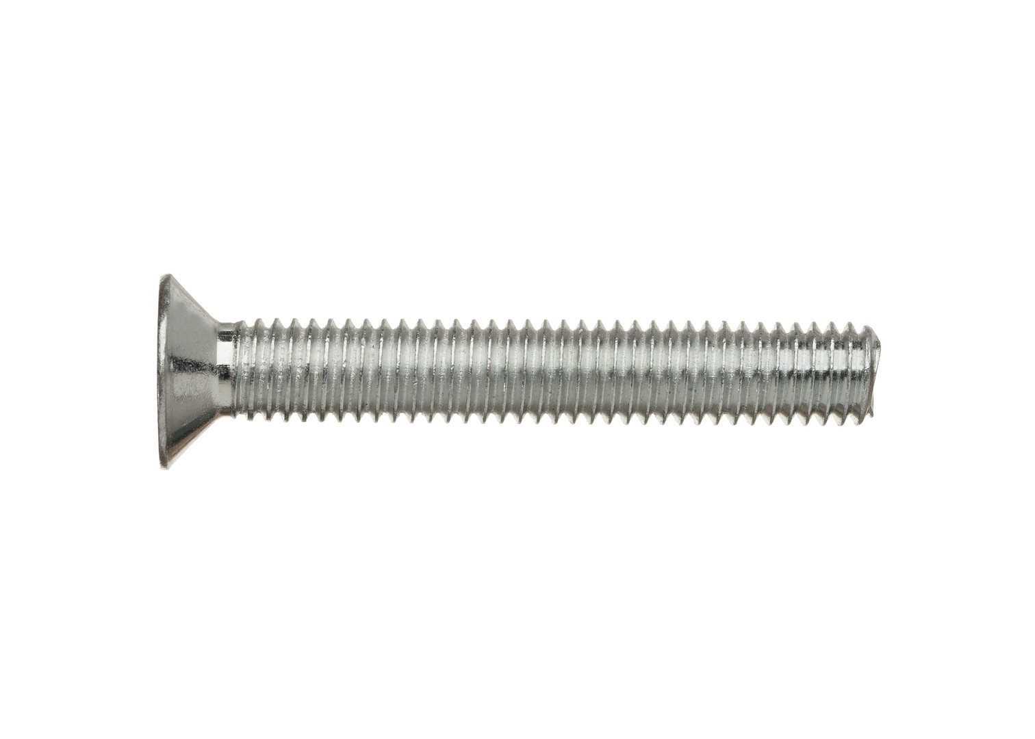 Винт с потайной головкой полностью утапливается в деталь, что позволяет оставить поверхность детали полностью плоской, без выступления головки. Класс прочности 4,6 или 5,8. Винты имеют двойное назначение могут ввинчиваться в металлические резьбовые отверстия или фиксировать деталь по средствам шайб и гаек. Как правило, имеют шлиц PH. Очень важно в работе с винтами правильно подбирать шлиц для ввинчивания, иначе грани головки очень быстро стираются и процесс демонтажа становится очень трудоемким. Данный вид крепежа (класс 4,6-5,8) не рекомендуется применять в динамических и ответственных креплениях. Не рекомендуется применять при температурах ниже -15 град. и выше 70 град.