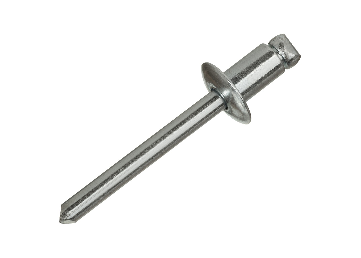 Заклепки вытяжные комбинированные (сталь-сталь) применяются для крепления тонколистового металла и других твердых материалов, доступных для монтажа только с одной стороны. Тело и стержень заклепки изготовлен из оцинкованной стали. Диаметр сверла для заклепки 6,5 мм. Прочность соединения на разрыв (стальные листы) - 915 кг. При долгосрочном контакте с водой тело заклепки корозирует, в результате происходит разрушение крепления. Рабочая нагрузка не должна превышать 20 % от предельной. Не совместима с нержавеющей сталью. Длинна заклепки должна быть на 3-6 мм больше толщины скрепляемых материалов.