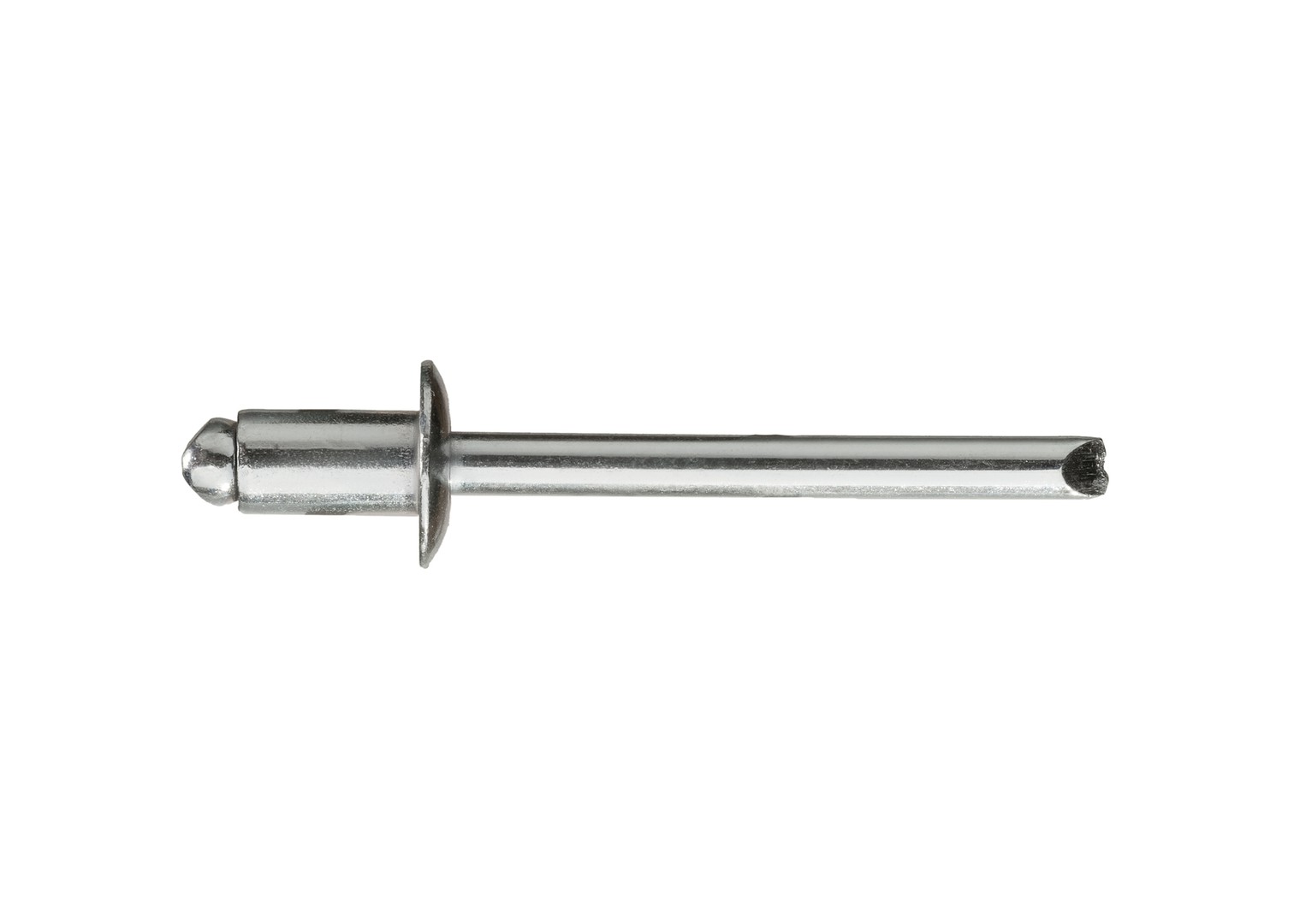 Заклепки вытяжные комбинированные (алюминий-сталь) применяются для крепления тонколистового металла и других твердых материалов, доступных для монтажа только с одной стороны. Тело заклепки изготовлено из алюминия, стержень заклепки изготовлен из оцинкованной стали. Диаметр сверла для заклепки 3,2 мм. Прочность соединения на разрыв (стальные листы) - 135 кг. При долгосрочном контакте с водой алюминиевая втулка способна окисляться, в результате происходит разрушение крепления. Рабочая нагрузка не должна превышать 20 % от предельной. Совместима со всеми сталями. Длинна заклепки должна быть на 3-6 мм больше толщины скрепляемых материалов.