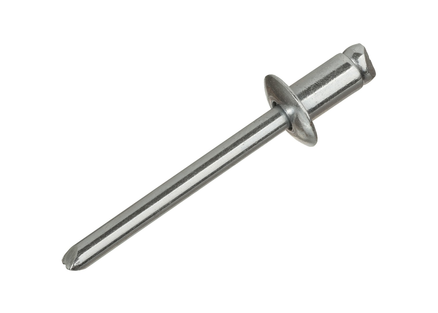 Заклепки вытяжные комбинированные (алюминий-сталь) применяются для крепления тонколистового металла и других твердых материалов, доступных для монтажа только с одной стороны. Тело заклепки изготовлено из алюминия, стержень заклепки изготовлен из оцинкованной стали. Диаметр сверла для заклепки 5,0 мм. Прочность соединения на разрыв (стальные листы) - 305 кг. При долгосрочном контакте с водой алюминиевая втулка способна окисляться, в результате происходит разрушение крепления. Рабочая нагрузка не должна превышать 20 % от предельной. Совместима со всеми сталями. Длинна заклепки должна быть на 3-6 мм больше толщины скрепляемых материалов.